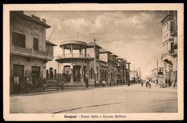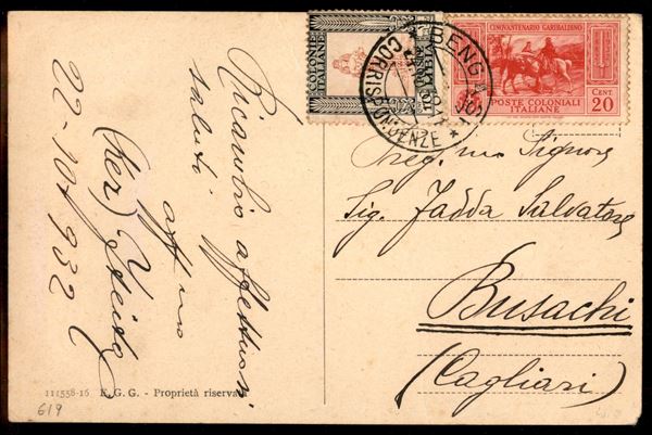 20 cent Garibaldi (2) + complementare (47) su cartolina da Bengasi (Corso Italia e Circolo Militare) a Cagliari del 24.10.32