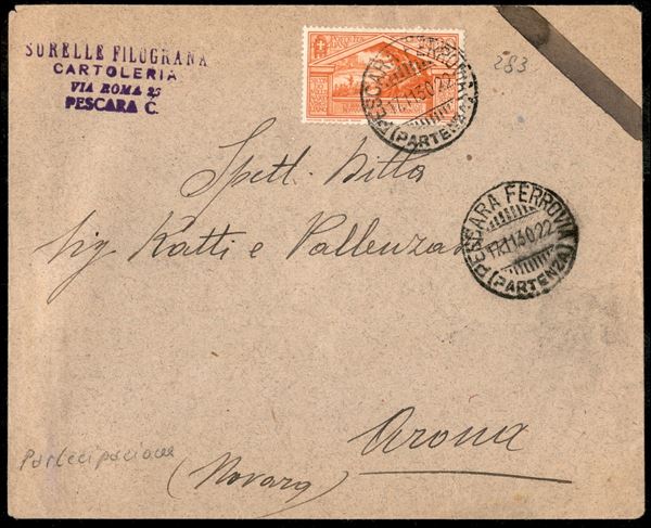 20 cent isolato su busta aperta in tariffa partecipazioni da Pescara per Arona del 12.11.30 - non comune in questa tariffa