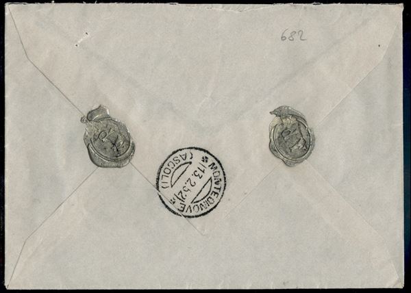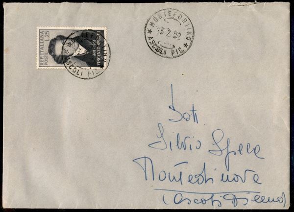 25 lire Bellini (682) isolato su lettera da Montefortino per Montedinove del 13.2.52