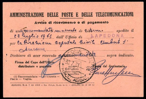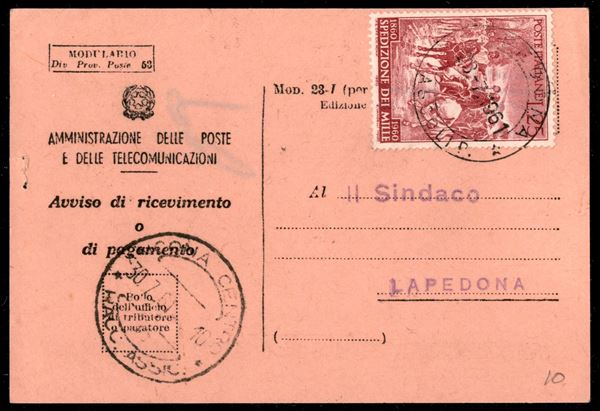 25 lire Garibaldi (883) isolato su ricevuta di ritorno