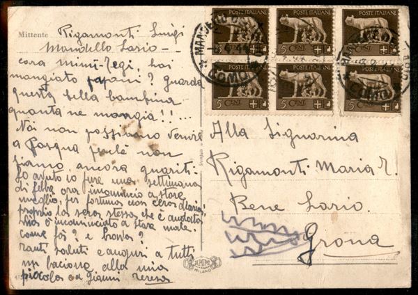 5 cent Imperiale (243) in quartina + coppia verticale con spostamento di dentellatura verticale a sinistra su cartolina da Mandello del Lario a Grana del 8.4.44