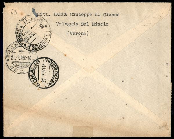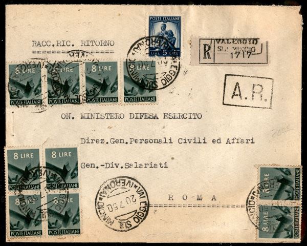 5 lire + coppia + quartina + striscia di quattro del 8 lire Democratica (555 + 557) su raccomandata da Valeggio sul Mincio per Roma del 20.7.50