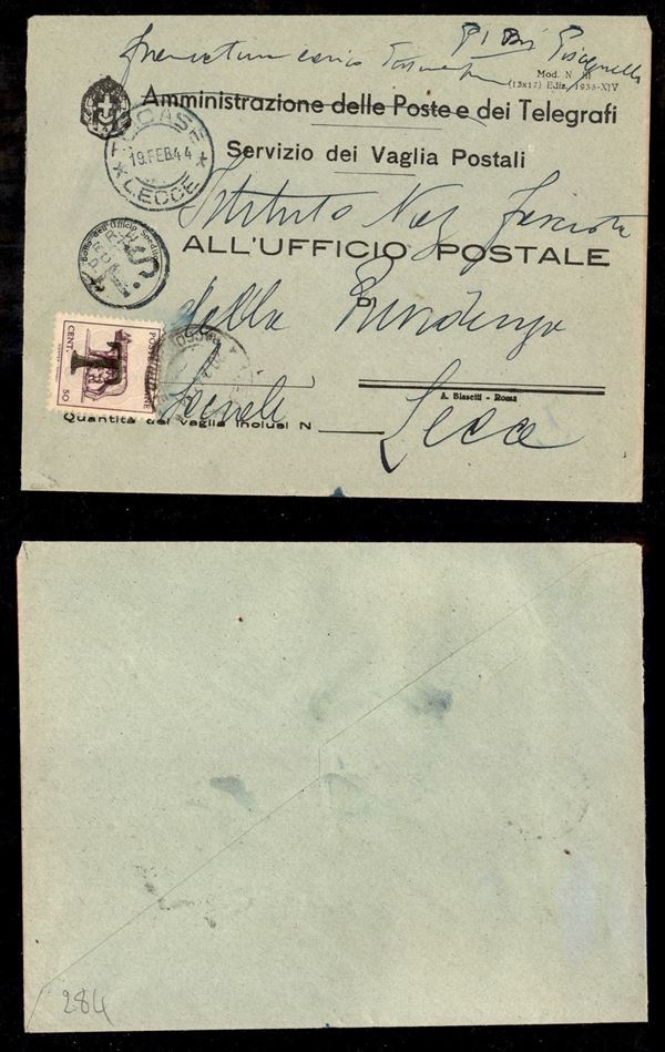 50 cent (515A) come tassa (Lecce 20.2.44) su busta da Tricase