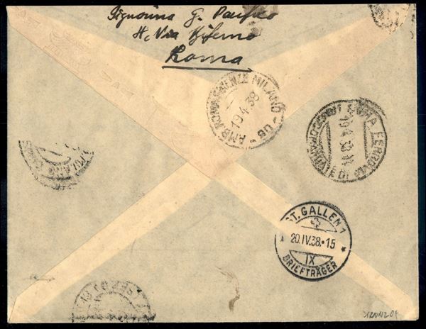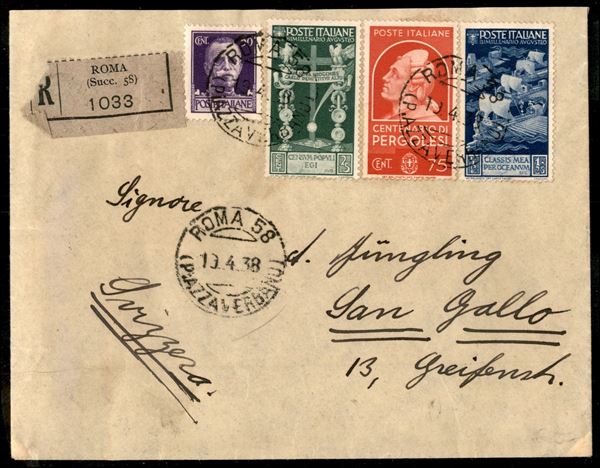 50 cent Imperiale + 25 cent + 1,25 lire Augusto + 75 cent Pergolesi (251 + 419 + 423 + 431) su raccomandata per la Svizzera da Roma Succ. 58 Piazza Verbano per San Gallo del 19.4.38