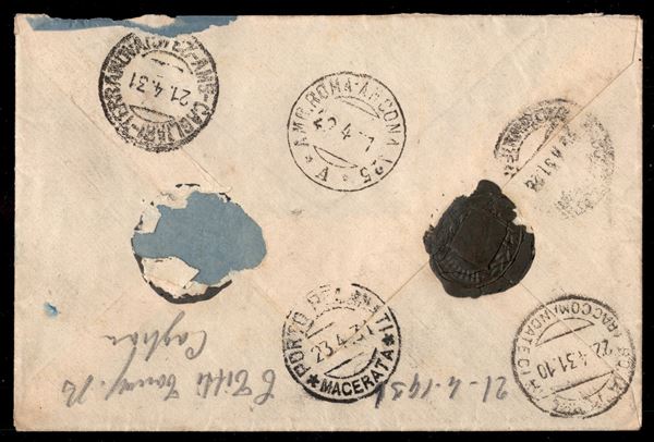 50 cent Imperiale (251) + 1,25 lire S.Antonio (297) + 1,25 lire Espresso (12) su Raccomandata Espresso da Cagliari 21.4.31 per Portorecanati