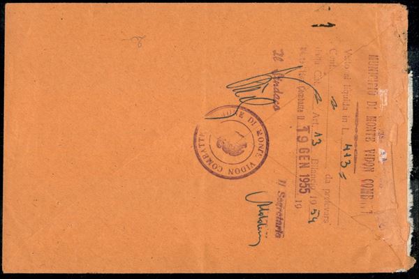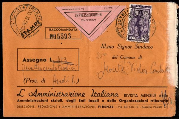 50 lire Italia al Lavoro (647) su busta raccomandata assegno da Firenze per Monte Vidon Corrado del 30.12.54