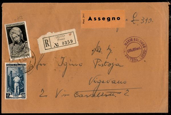 60 lire Anno Mariano + 15 lire Italia al Lavoro (641 + 752) su raccomandata assegno lire 310 da Lecco per Vigevano del 3.7.55
