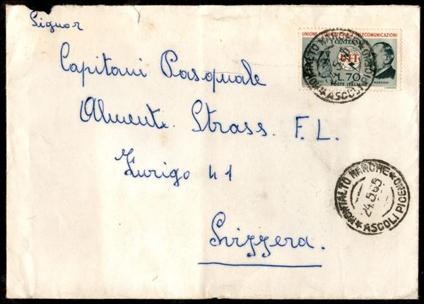 70 lire U.I.T. (996) isolato su lettera da Montalto Marche per Zurigo del 24.5.65