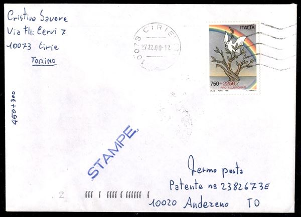 750 lire Pro Alluvionati (2250) isolato su stampe in fermo posta da Cirič per Andezeno del 27.12.00