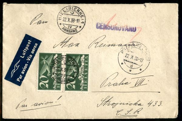 Aerogramma de Biel per Praga del 22.10.38 con bollo di censura