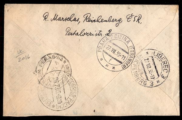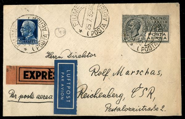Aerogramma Espresso da Fiume per Reichenberg (Cecoslovacchia) del 25.7.35