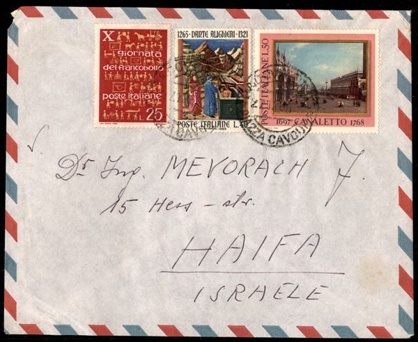 Aerogramma per Haifa (Israele) con affrancatura tricolore (1004 + 1095 + 1105)