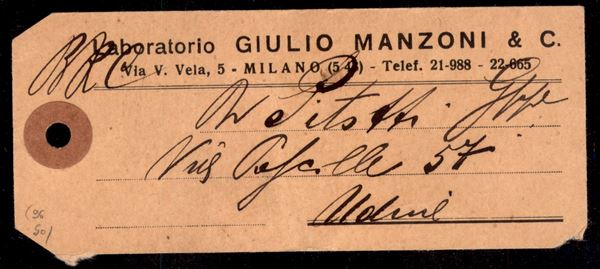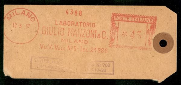 Affrancatura Meccanica rossa da 45 cent laboratorio Giulio Manzoni Milano su Talloncino saggio di medicinali da Milano per Udine 12.5.37