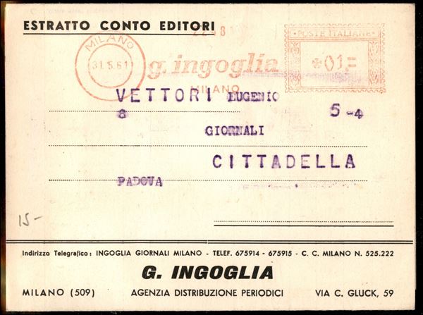 Affrancatura meccanica rossa lire 1 con tassello pubblicitario G. Ingroglia su estratto conto giornali da Milano per Cittadella del 31.5.61
