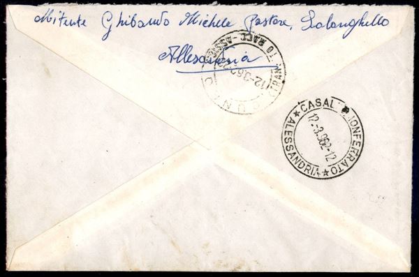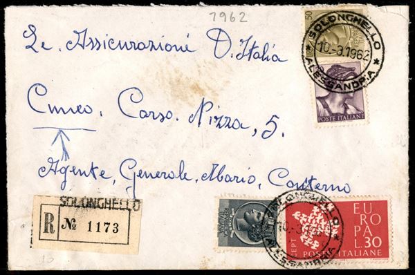 Affrancatura mista - 30 lire Michelangiolesca + 50 lire + 5 lire Siracusana + 30 lire Europa su raccomandata espresso da Solonghello per Cuneo del 10.3.1962
