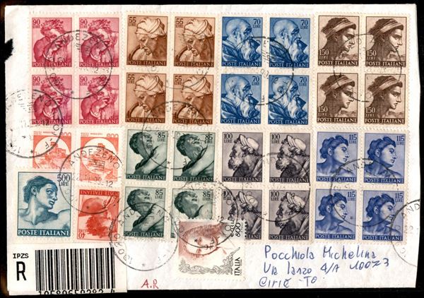 Affrancatura mista - varie quartine + singolo 500 lire Michelangiolesca + Castelli macchinette + Donne nell'Arte su raccomandata da Andezeno del 22.1.99 - in tariffa esatta