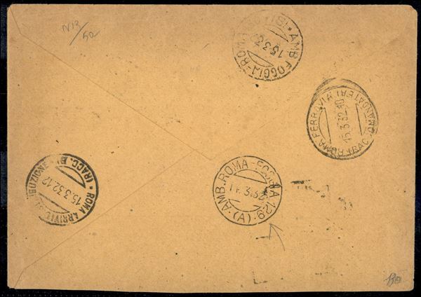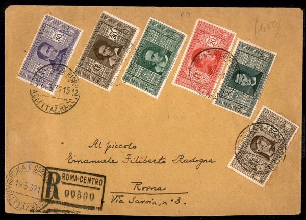 Affrancatura sei colori emissione Societą Dante Alighieri (303/08) su raccomandata per cittą da Roma 14.3.32 - 20 cent difettoso