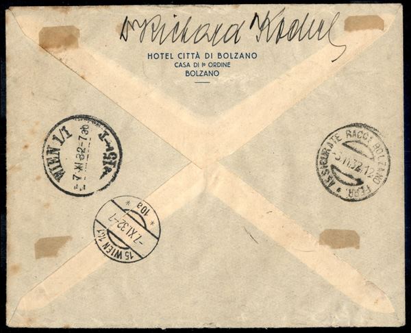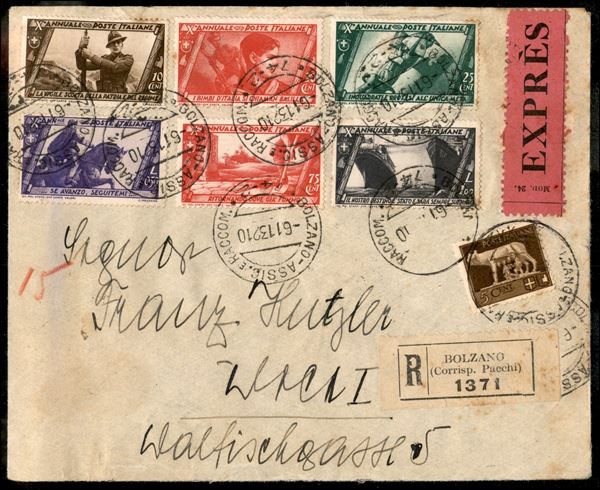 Affrancatura sette colori con sei valori Marcia su Roma + 5 cent Imperiale (243 + 326 + 328/329 + 332 + 334/35) su raccomandata espresso per l'Austria da Bolzano del 6.11.32