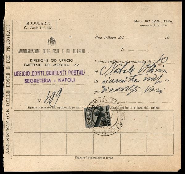 Ammenda al personale mod. 162 affrancata con 10 lire Democratica (558) con annullo Cassa P.T. Napoli Sez. Carte Contabili 15.1.47 - non comune
