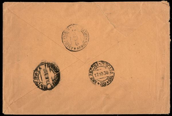Annullo muto 17.10.30 su raccomandata tre porti con coppia del 50 cent Imperiale + 1,75 lire da Loro Piceno per Ascoli Piceno