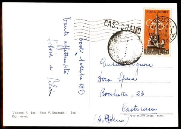 Annullo muto + lineare Castorano in arrivo su cartolina da Todi del 1 .10.1959 affrancata con 15 lire Preolimpica - splendida