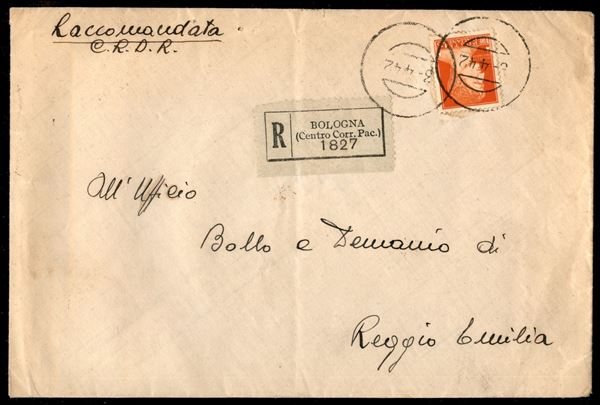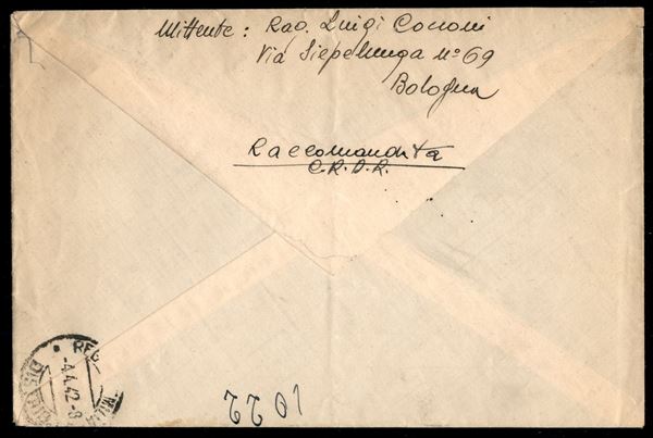 Annullo muto tipo guller 3.4.42 su raccomandata con Imperiale 1,75 lire da Bologna per Reggio Emilia