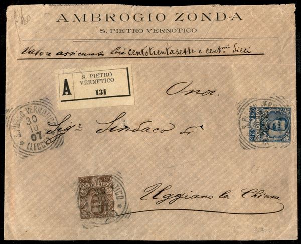 Assicurata lire 137,10 con 25 cent + 40 cent (73 + 74) da S. Pietro Vernetico per Uggiano la Chiesa del 30.10.07