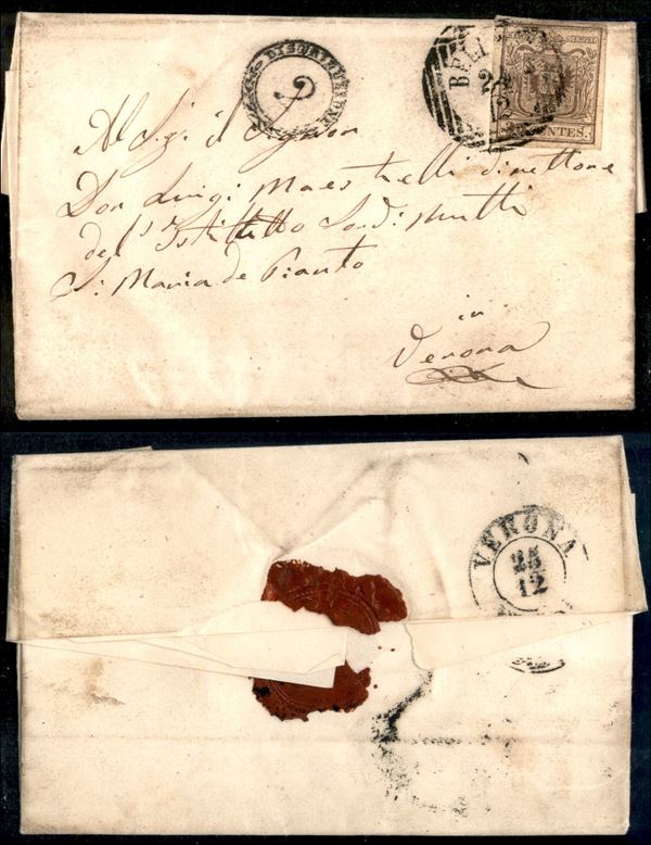 Belluno (P.ti 4) - 30 cent (7) su lettera per Verona Distribuzione 2 (P.ti 3) a lato