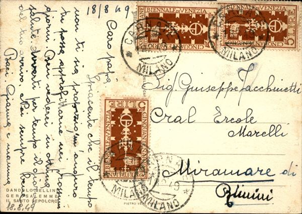 Biennale tre 5 lire (594) su cartolina da Carnate 18.8.49 per Miramare di Rimini