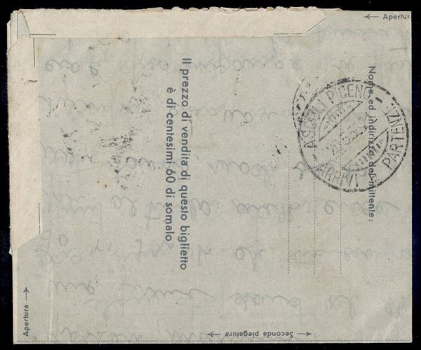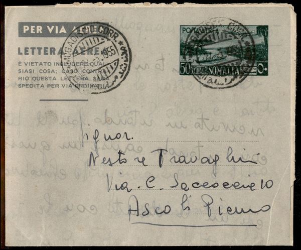 Biglietto postale aereo 50 cent (1) da Mogadiscio a Ascoli Piceno del 24.5.1955