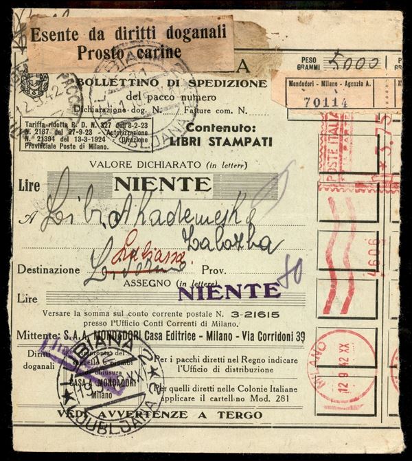 Bollettino Pacchi da Milano del 12.9.42 tassato in arrivo al retro - Raybaudi