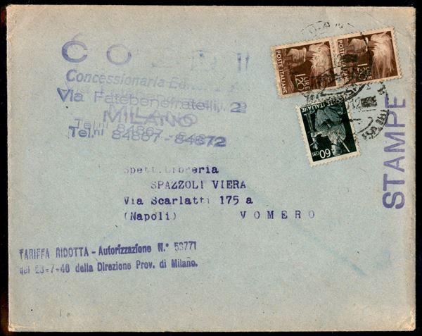 Busta aperta in tariffa stampe del febbraio 1947 da Milano a Napoli affrancata con 60 cent + 1,20 lire Democratica