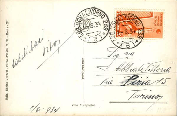 Calcio 20 cent (357) su cartolina per Torino con annullo Amb. Roma Livorno 239 (B) 1.6.34 - giorno della partita Italia Spagna