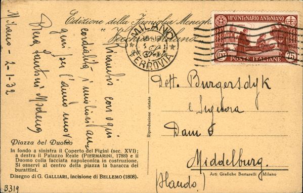 Cartolina illustrata per l'Olanda con 75 cent S. Antonio (296) da Milano 3.1.32 per Middelburg