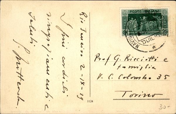 Cartolina per Torino affrancata con Montecassino 25 cent annullato Navigazione Generale Italiana Piroscafo