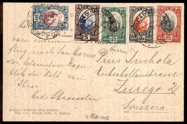 Cartolina per Zurigo con bella affrancatura cinque colori dell'emissione Vedute e Palazzo del Consiglio (141/42 + 145/46 + 148)