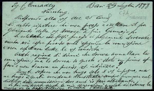 Cartolina Postale per l'estero 10 cent (C7A) mill. 87 da Bari Succ. Ferrovia 29.7.88 per Norimberga