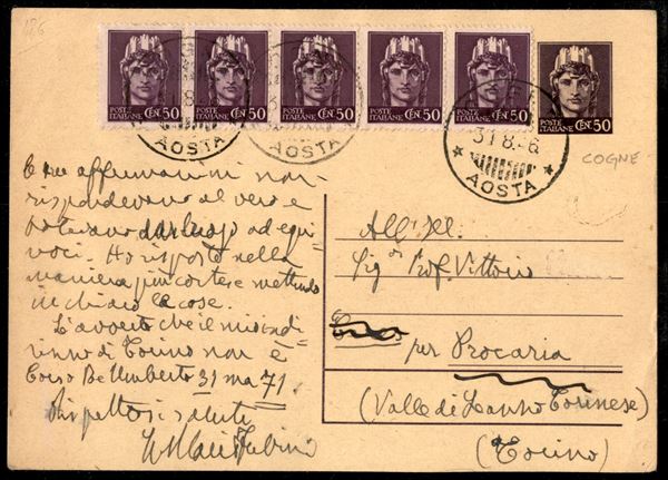 Cartolina Postale Turrita 50 cent affrancata con Turrita coppia + striscia di tre 50 cent da Cogne 31.8.46 per Procaria