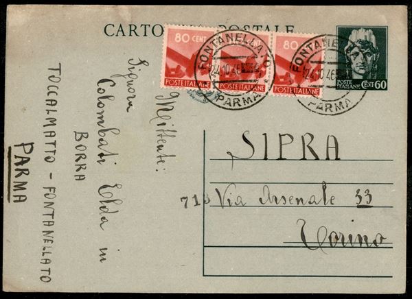 Cartolina Postale Turrita con stemma 60 cent (C123) affrancata con Democratica striscia di tre 80 cent da Fontanella Parma 24.10.46 per Torino