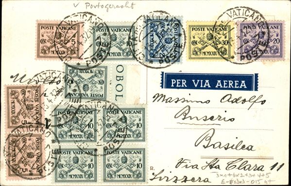 Cartolina via aerea per Basilea del 13.4.32 con Conciliazione tre 5 cent + quartina e due singoli 10 cent + 20 cent + 25 cent + 30 cent (1/5) - fresca