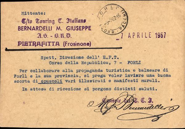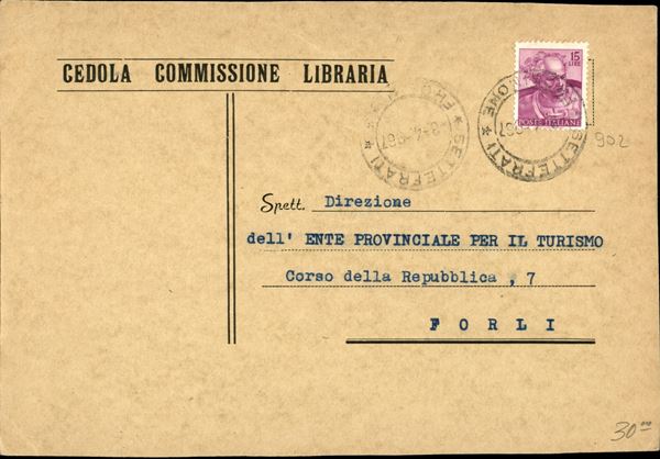 Cedola di commissione libraria con Michelangiolesca 15 lire (902) da Settefrati 8.4.67 per Forlė
