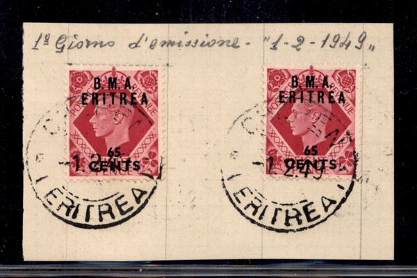 Cheren 1.2.49 - 65 cent su 8 pence (8) - due pezzi su frammento con annullo del giorno d’emissione