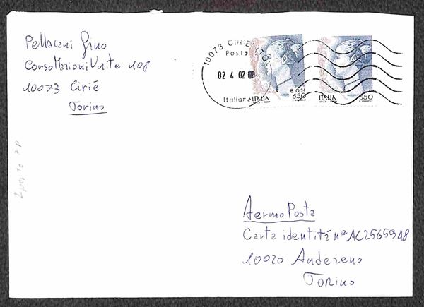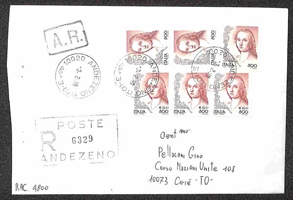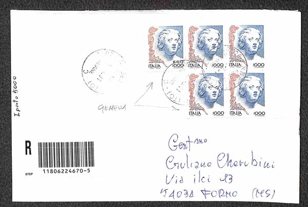 Cinque oggetti di corrispondenza affrancati con valori gemelli Donne nell'Arte valore in lire + corrispondenti valori in lire/euro (2393/97 e 2359/63)