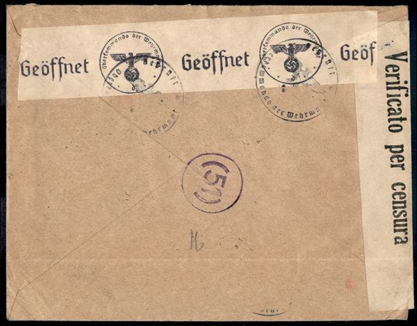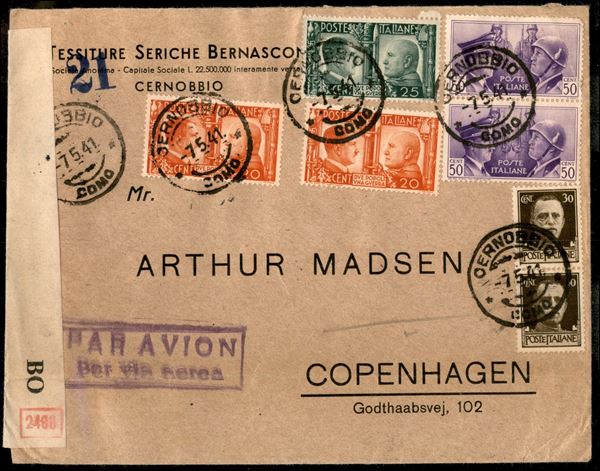 Coppia 30 cent Imperiale + due 20 cent + 25 cent + coppia 50 cent Hitler e Mussolini (249 + 453/55) su lettera via aerea per Copenhagen da Cernobbio del 7.5.41 - bolli e fascetta della censura italiana e tedesca