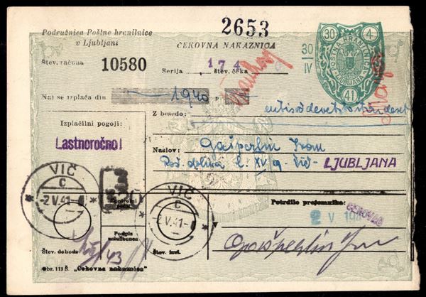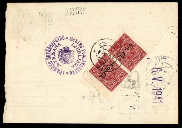 Coppia del 1 din Segnatasse (2) al retro di Bollettino da Vic del 2.5.41