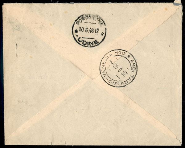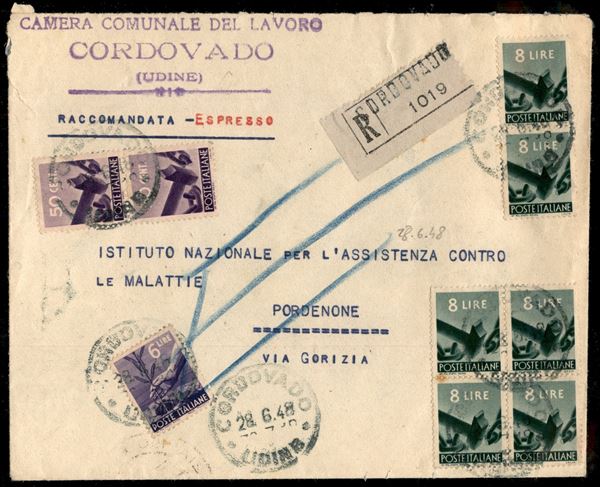 Coppia del 50 cent + 6 lire + quartina e coppia del 8 lire Democratica (547 + 556 + 557) su raccomandata espresso da Cordovado a Pordenone del 28.6.48 - annullo verdastro
