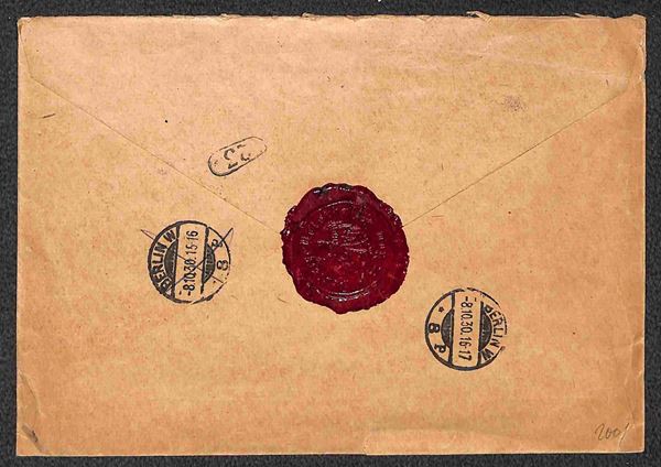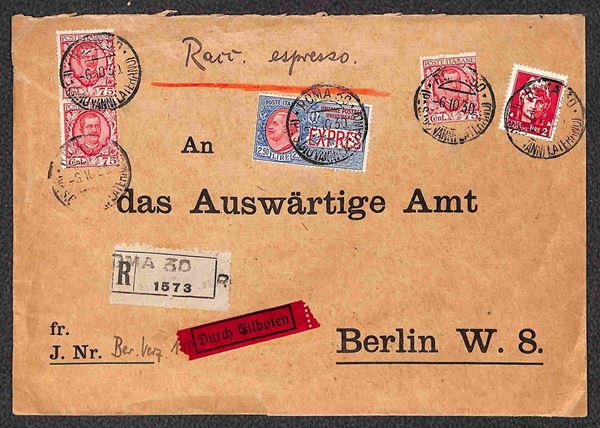Coppia + singolo 75 cent Floreale + 2 lire Imperiale + 2,50 lire Espressi (201 + 255 + Espressi 14) su raccomandata espresso da Roma 30 Piazza S. Giovanni Laterano a Berlino del 6.10.30 - al verso splendido sigillo in ceralacca con aquila imperiale