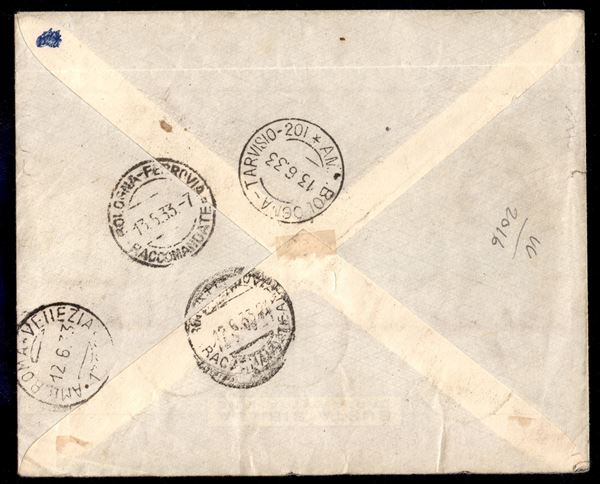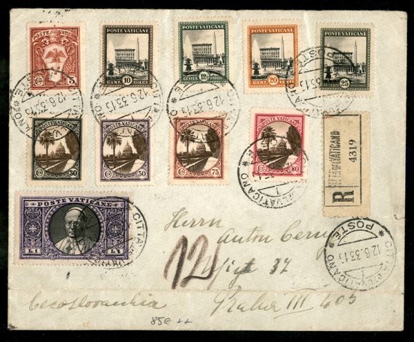 Dieci esemplari dell'emissione Giardini e Medaglioni (19/28) su raccomandata per la Cecoslovacchia del 12 giu. 1933