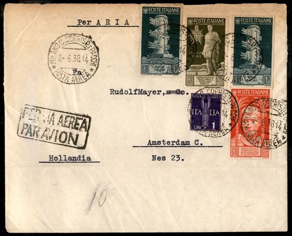 Due 10 cent + 30 cent + 75 cent Augusto + 1 lira Posta Aerea Miti e Simboli (416 + 420 + 422 + Aerea 14) su lettera via aerea per Amsterdam