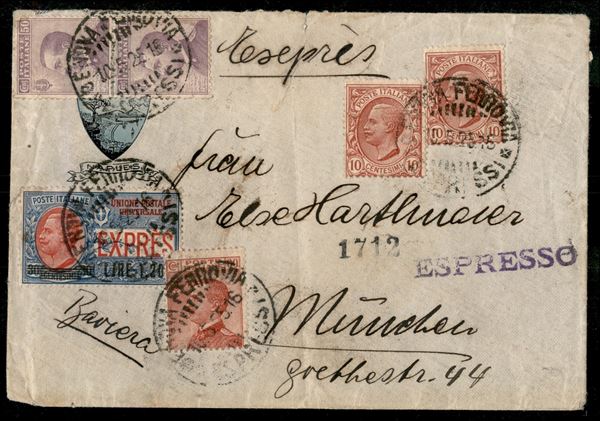 Due 10 cent Leoni + coppia 50 cent + 60 cent Michetti (82 + 85 + 111) +1,20 lire su 30 cent Espressi (5) su lettera espresso per Monaco di Baviera da Genova del 10.5.25